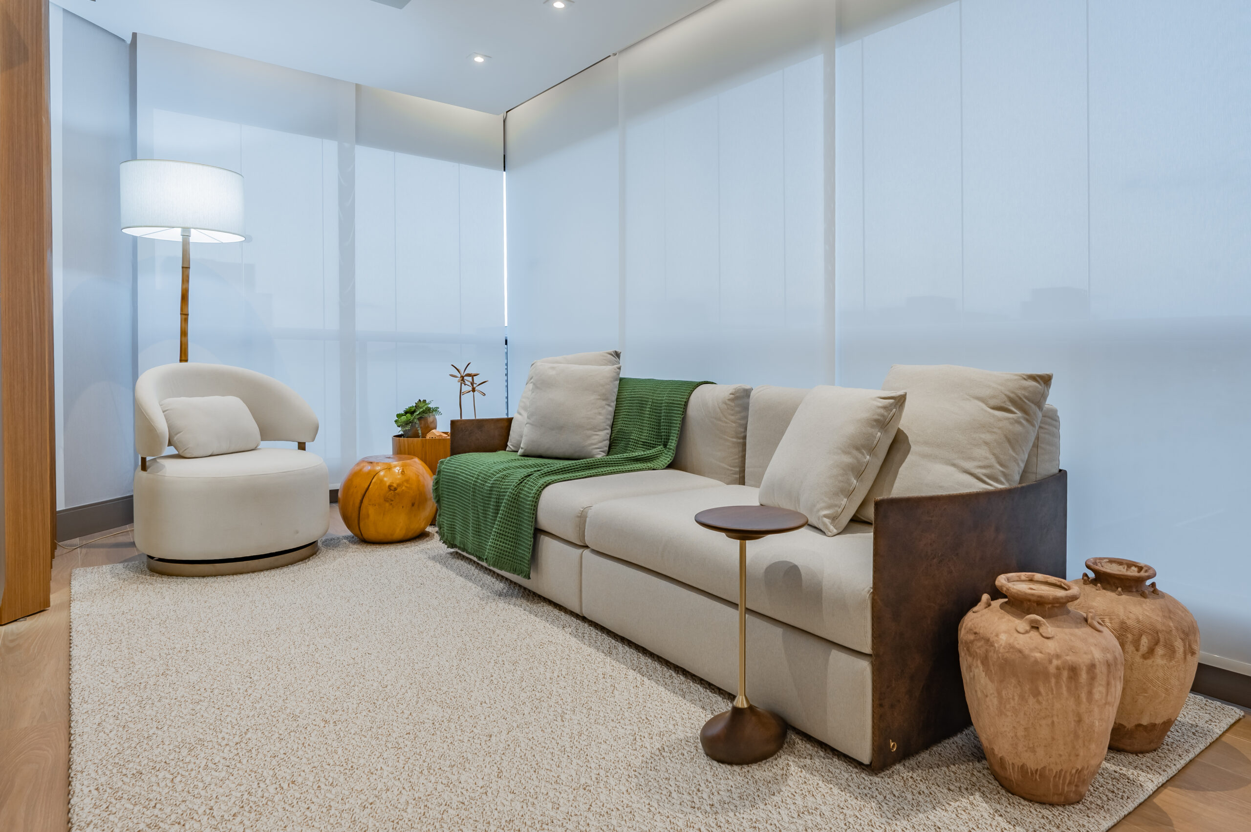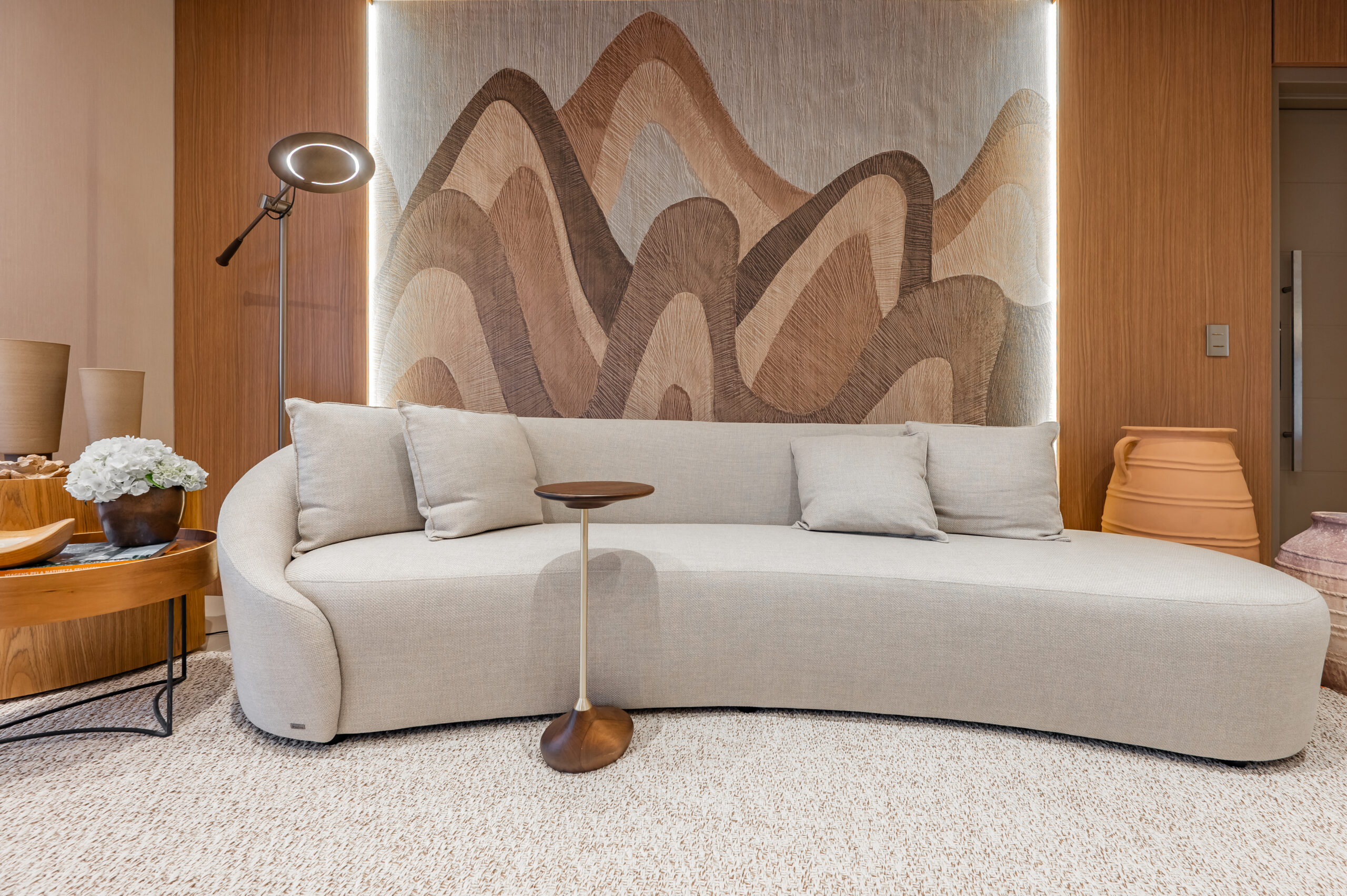 A mágica do banho de loja é consistente e favorece a beleza e harmonia entre os espaços. Um apartamento que ganhou personalidade através do leque de cores que se misturam entre si, ditando elegância, sofisticação e conforto. O painel de 2,80 X 2,50 foi aplicado na sala, num “conversê”, favorecendo um ambiente acalorado e com um atrativo acolhedor e cheio de charme. Mobiliário e acessórios complementam o projeto com texturas e formas diferenciadas, dando movimento e muita integração.